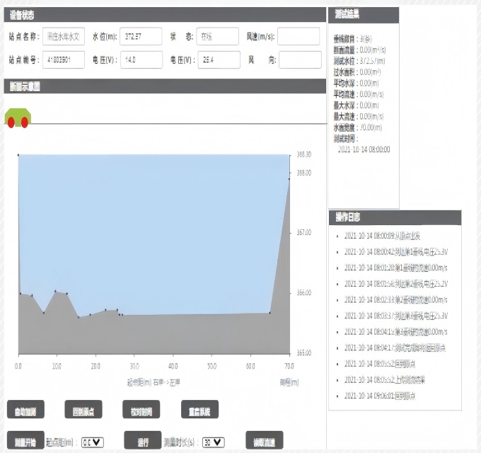控制单元同时采集水位数据,完成流量计算,并将流量数据通过4G(GPRS)网络发送至服务器平台软件,从而实现断面无人值守自动测流。当完成测流后,将雷达小车回到仪器室内,自动进行充电。